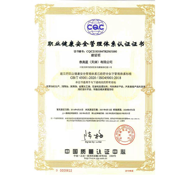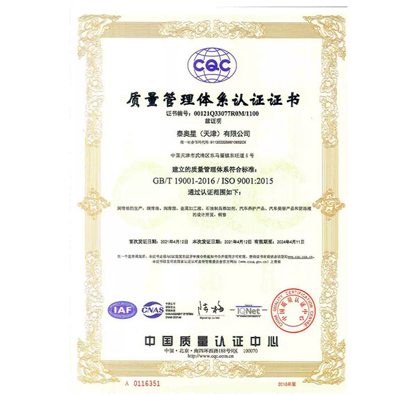 多年來(lái),泰奧星堅(jiān)持質(zhì)量至上的經(jīng)營(yíng)理念,先后通過(guò)了ISO9001質(zhì)量管理體系、ISO14001環(huán)境管理體系和、OHSAS18001職業(yè)健康安全管理體系及IATF16949質(zhì)量管理體系四大體系認(rèn)證。嚴(yán)格的質(zhì)量控制體系保障了公司產(chǎn)品質(zhì)量穩(wěn)定優(yōu)良,近年來(lái),泰奧星先后被認(rèn)定為CMMC中國(guó)潤(rùn)滑材料行業(yè)十強(qiáng)、全國(guó)潤(rùn)滑十佳企業(yè)、中國(guó)綠色低碳先鋒企業(yè)等。