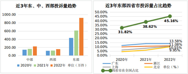 從近三年趨勢看,因平臺經(jīng)濟(jì)的跨區(qū)域擴(kuò)張、人口資本的跨區(qū)域流動、市場要素的跨區(qū)域配置,廣東、浙江、上海、北京4個省市的消費正在加速集聚。消費投訴數(shù)量與消費活躍水平呈正相關(guān)關(guān)系,四省市消費投訴數(shù)量在全國的占比從2020年的31.8%增長到2022年的45.16%。消費投訴的加速集聚在一定程度上反映了消費供給側(cè)發(fā)展的不平衡,需要進(jìn)一步恢復(fù)和擴(kuò)大中西部地區(qū)消費,推動更高質(zhì)量、更加平衡的發(fā)展。