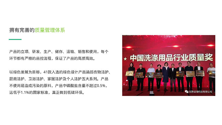 2018年11月,以綠色發(fā)展為目標(biāo)的41款綠傘產(chǎn)品入選綠色設(shè)計產(chǎn)品。這些產(chǎn)品均不使用易造成污染的原料,磷酸鹽含量不超過0.5%,遠低于1.1%的國家標(biāo)準(zhǔn),真正做到低碳環(huán)保。同年,綠傘榮獲中國洗滌用品工業(yè)協(xié)會頒發(fā)的“中國洗滌用品行業(yè)質(zhì)量獎”,這一獎項的頒發(fā)充分肯定了綠傘一直以來嚴(yán)把質(zhì)量關(guān)、綠色環(huán)保的發(fā)展戰(zhàn)略。