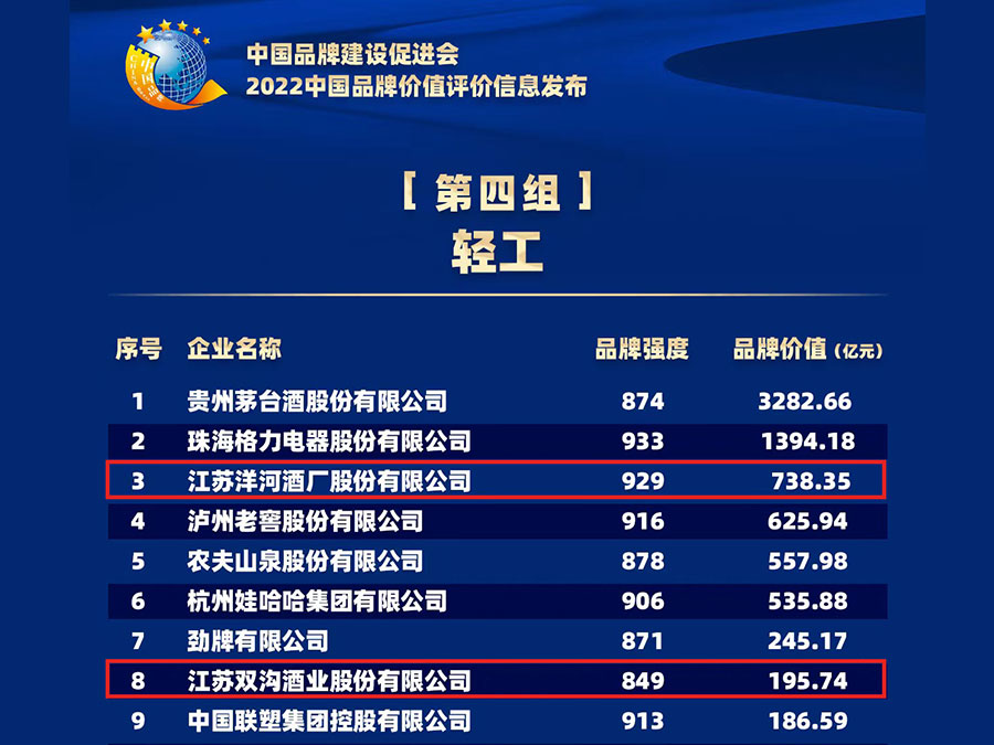 作為中國名酒的杰出代表,洋河、雙溝多次在全國評酒會上榮獲國家名酒稱號。2009年11月,洋河股份在深圳證券交易所掛牌上市。2012年7月,洋河股份躋身FT上市公司全球500強。2015年,入選“2015年中國品牌價值酒水飲料類地理標志產(chǎn)品”,成為白酒行業(yè)僅有的兩個入選品牌之一。近年來,洋河經(jīng)營發(fā)展質量不斷提升,銷售規(guī)模居行業(yè)前三甲,品牌價值持續(xù)攀升。2020年,品牌價值榮登“2020中國品牌價值”輕工業(yè)榜單第三名,白酒行業(yè)第二;并入圍“2020中國上市公司品牌價值TOP100”,位居第42位。2021年,在中國品牌價值評價榜單上,洋河股份以702.01億元的品牌價值榮登輕工業(yè)榜單第3名;并入選2021新型實體企業(yè)百強榜;雙溝酒業(yè)以199.64億元的品牌價值位列第9名。
