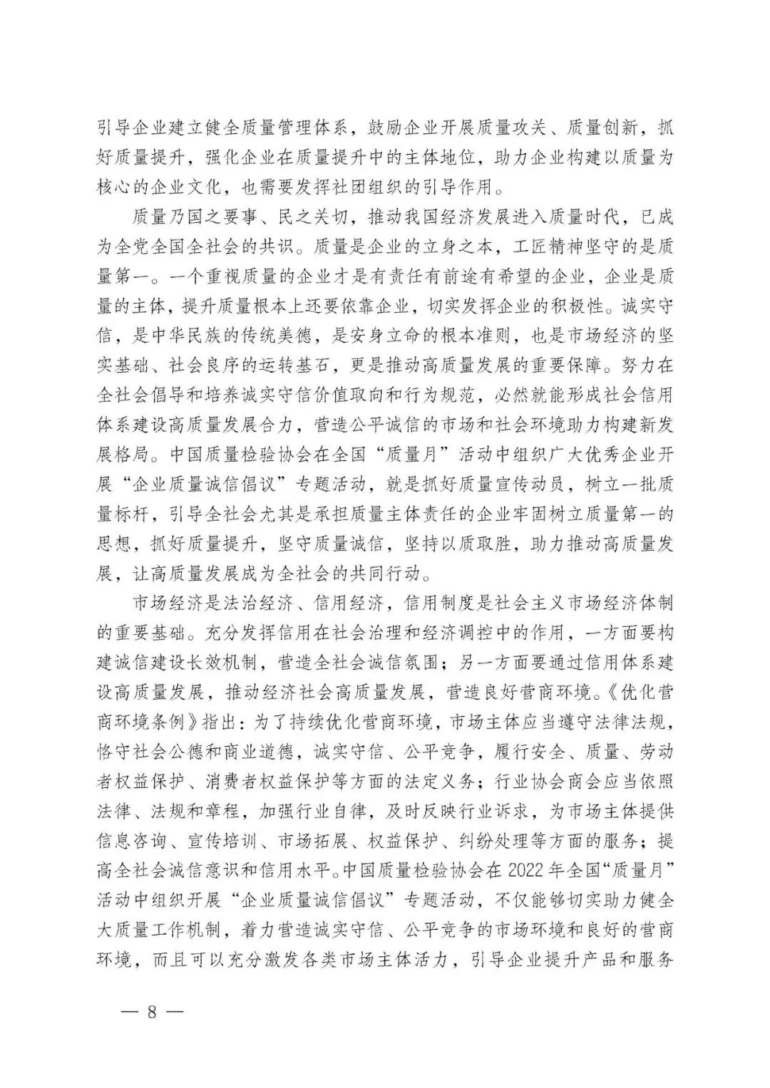持續(xù)堅(jiān)守,久久為功。45年來,全國“質(zhì)量月”活動(dòng)參與者上億人次,中國質(zhì)量工作也歷經(jīng)了“質(zhì)量振興”“質(zhì)量發(fā)展”及至當(dāng)下“質(zhì)量強(qiáng)國”的非凡歷程。中國質(zhì)量檢驗(yàn)協(xié)會(huì)作為始于1996年就參與全國“質(zhì)量月”的親歷者,我們必將繼續(xù)努力舉辦好全國“質(zhì)量月”企業(yè)質(zhì)量誠信倡議專題活動(dòng),為助力擴(kuò)大全國“質(zhì)量月”活動(dòng)在廣大企業(yè)中的影響力作出不可或缺的積極努力。