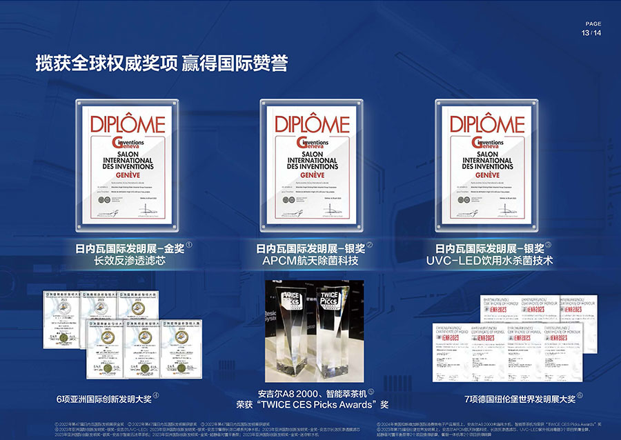 38年間,安吉爾堅持科技創(chuàng)新并主導(dǎo)行業(yè)技術(shù)升級,參與制定17項國家及行業(yè)標(biāo)準(zhǔn),獲得900余項技術(shù)專利,建成4大水質(zhì)實驗室。2023年,該企業(yè)憑借創(chuàng)新實力包攬全球9項發(fā)明大獎,包括3項日內(nèi)瓦國際發(fā)明展獎項與6項亞洲創(chuàng)新發(fā)明展獎項。