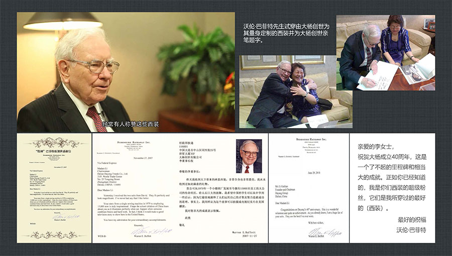 大楊集團(tuán)堅持做民族品牌,揚(yáng)國人志氣,致力打造國際一流服裝品牌。上世紀(jì)90年代創(chuàng)立了第一個自主品牌——TRANDS(創(chuàng)世),先后榮獲“中國出口名牌”、“中國名牌產(chǎn)品”等稱號,并獲得中國服裝協(xié)會頒發(fā)的中國服裝品牌品質(zhì)大獎,成為當(dāng)今中國高級男裝的領(lǐng)軍品牌之一。TRANDS(創(chuàng)世)品牌申報國家非遺創(chuàng)新產(chǎn)品的“‘龍’金絲蘇繡中式華服”被授予十大類紡織創(chuàng)新產(chǎn)品。“股神”沃倫·巴菲特、微軟主席比爾·蓋茨、世界經(jīng)濟(jì)論壇主席克勞斯·施瓦布等國際精英人士,均已成為品牌的忠實客戶。目前,大楊集團(tuán)已形成以高級男裝品牌TRANDS(創(chuàng)世)為龍頭,團(tuán)體定制高級商務(wù)裝品牌KEYMEN(凱門)、高級定制品牌凱門定制、網(wǎng)上直銷品牌YOUSOKU(優(yōu)·搜·酷)、學(xué)生裝品牌KEYMEN KIDS等組成的自主品牌梯隊。