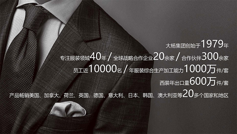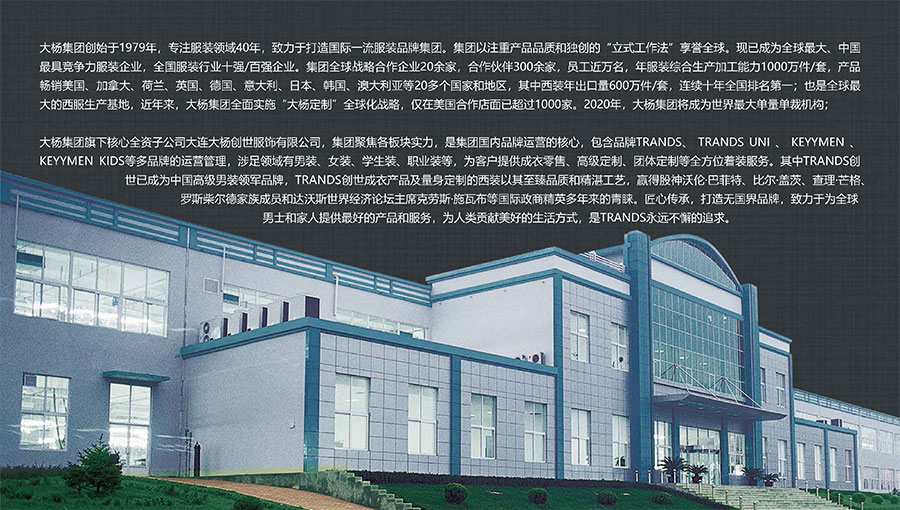 大楊集團(tuán)創(chuàng)建于1979年,總部位于遼寧省大連市,主要生產(chǎn)和銷售各類中高檔服裝產(chǎn)品為主的國際化大型服裝企業(yè),以西裝縫制享譽(yù)全球,是世界重要的西裝生產(chǎn)加工基地?,F(xiàn)有直屬(控股)成員企業(yè)20家,員工4500人??毓勺庸敬筮B大楊創(chuàng)世股份有限公司2000年在上海證券交易所上市,并于2016年完成重大資產(chǎn)重組。
