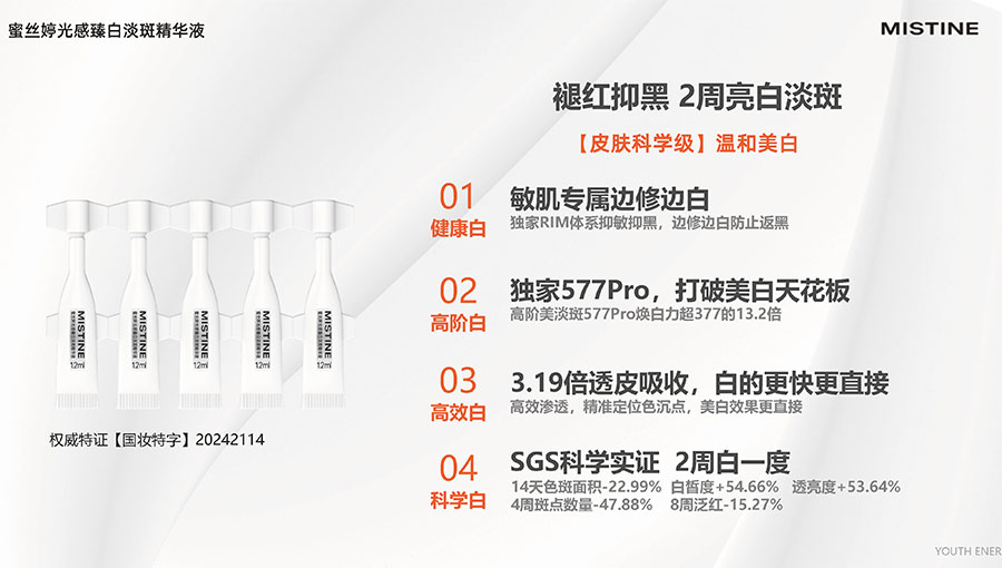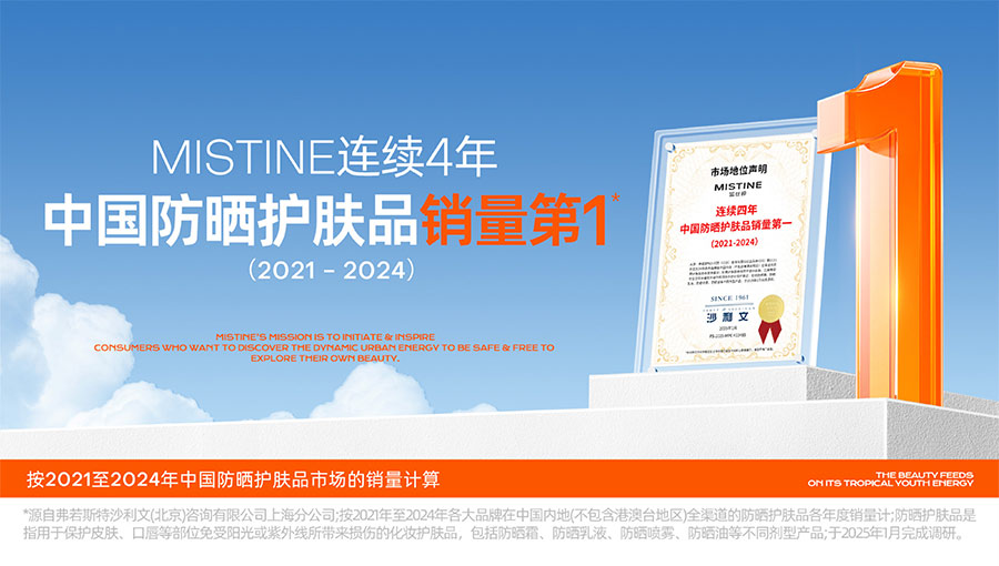 歷經(jīng)37年的科研沉淀,MISTINE蜜絲婷品牌在防曬、護膚、底妝、彩妝多個品類的產(chǎn)品開發(fā)中,堅持圍繞對“光”的研究,在光與防曬護膚、光與色彩妝容的產(chǎn)品應用層面,研究光、理解光、樂享光,持續(xù)不斷地提供產(chǎn)品解決方案,滿足消費者對防曬美白、潮流妝容、護膚健康的需求。防曬系列產(chǎn)品作為MISTINE蜜絲婷的知名品類,以物化生一體的全鏈路防曬技術(shù),憑借高倍防曬、清爽膚感的高功效和高質(zhì)價比勝出,自2021年連續(xù)三年位于中國防曬護膚品銷量領(lǐng)先。