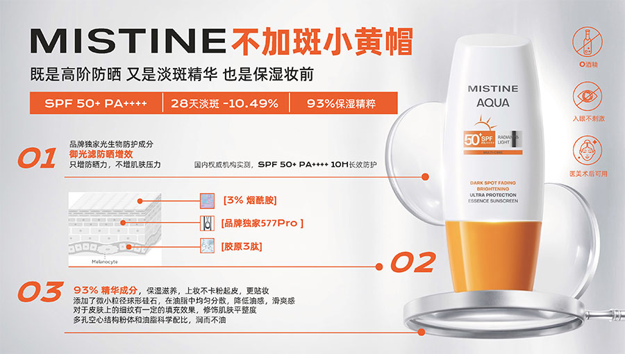 MISTINE蜜絲婷提出皮膚科學、前沿科技、靈魂成分、熱帶美學、卓越功效、保護環(huán)境六大品牌價值,致力于為全球女性提供豐富、安全、高品質(zhì)的美妝產(chǎn)品?;贛ISTINE蜜絲婷品牌首席顧問——全球計算生物學權(quán)威之一、諾貝爾化學獎得主Arieh Warshel的研究,MISTINE創(chuàng)新防曬品類推出「光生物學」防曬系統(tǒng),提出“外層防護、中層修護和底層抗損”防曬新理念,引領(lǐng)防曬從“表面防護”進入“深度抗光老”新時代。同時,MISTINE蜜絲婷還持續(xù)深耕專業(yè)彩妝市場,以熱帶美學基因造就產(chǎn)品防水防汗、高倍耐曬、長效持妝的優(yōu)勢,圍繞消費者需求打造多元化的產(chǎn)品矩陣,引領(lǐng)防曬、底妝賽道發(fā)展。