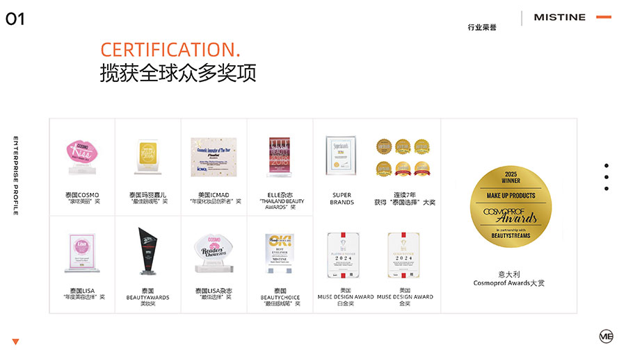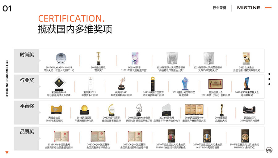37年來,MISTINE蜜絲婷步履不停,堅持從消費者出發(fā),以優(yōu)質(zhì)專研產(chǎn)品、適時而動的渠道策略和持續(xù)發(fā)力的品牌塑造,贏得眾多消費者的喜愛和行業(yè)內(nèi)外的贊許。迄今,MISTINE蜜絲婷已連續(xù)七年攬獲“泰國選擇”大獎,同時先后榮獲中國化妝品大會藍玫獎「年度競爭力品牌」、IQF國際品質(zhì)節(jié)暨消費領(lǐng)導力峰會「杰出消費影響力品牌」、CAQI中國質(zhì)量網(wǎng)「全國美妝行業(yè)質(zhì)量領(lǐng)先品牌」、天貓金妝獎超級單品「年度防曬獎」、凱度消費者指數(shù)「極具成長力品牌」等榮譽。