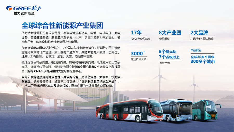 格力鈦新能源股份有限公司是一家集電池核心材料、電池、電機電控、充電設備、智能儲能系統、新能源汽車研發(fā)、生產、銷售以及動力電池回收、梯次利用為一體的全球綜合性新能源產業(yè)集團。