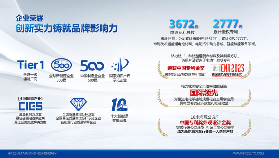 2022年,“一種鈦酸鋰復合材料及其制備方法、負極片及鋰離子電池”發(fā)明專利獲得中國專利金獎,摘得鋰電池行業(yè)內的發(fā)明專利“首金”;2023年,該專利技術再次斬獲第75屆德國紐倫堡發(fā)明國際金獎。“高安全大倍率儲能系統關鍵技術研發(fā)與應用”項目被中國機械工業(yè)聯合會鑒定達到“國際領先”水平。截至目前,格力鈦先后獲得“中國民營企業(yè)制造業(yè)500強”、“全國質量信得過產品”、“客車安全技術成果獎”、“中國儲能產業(yè)最具影響力企業(yè)獎、最佳系統集成商、最佳儲能電池供應商”等榮譽,獲得工信部頒發(fā)的“綠色工廠”榮譽稱號;上榜科技部發(fā)布的新能源領域獨角獸企業(yè),多年入選全球新能源企業(yè)500強,入選“全國百佳質量檢驗誠信標桿企業(yè)”、“國家知識產權優(yōu)勢企業(yè)”等。