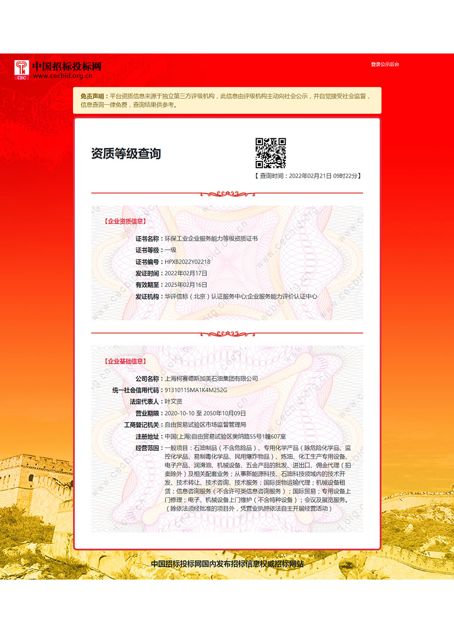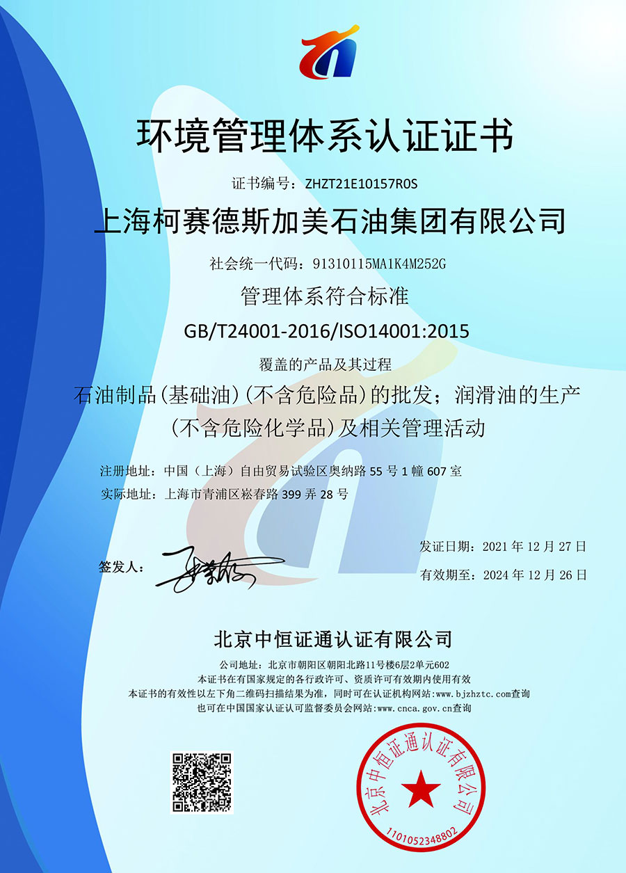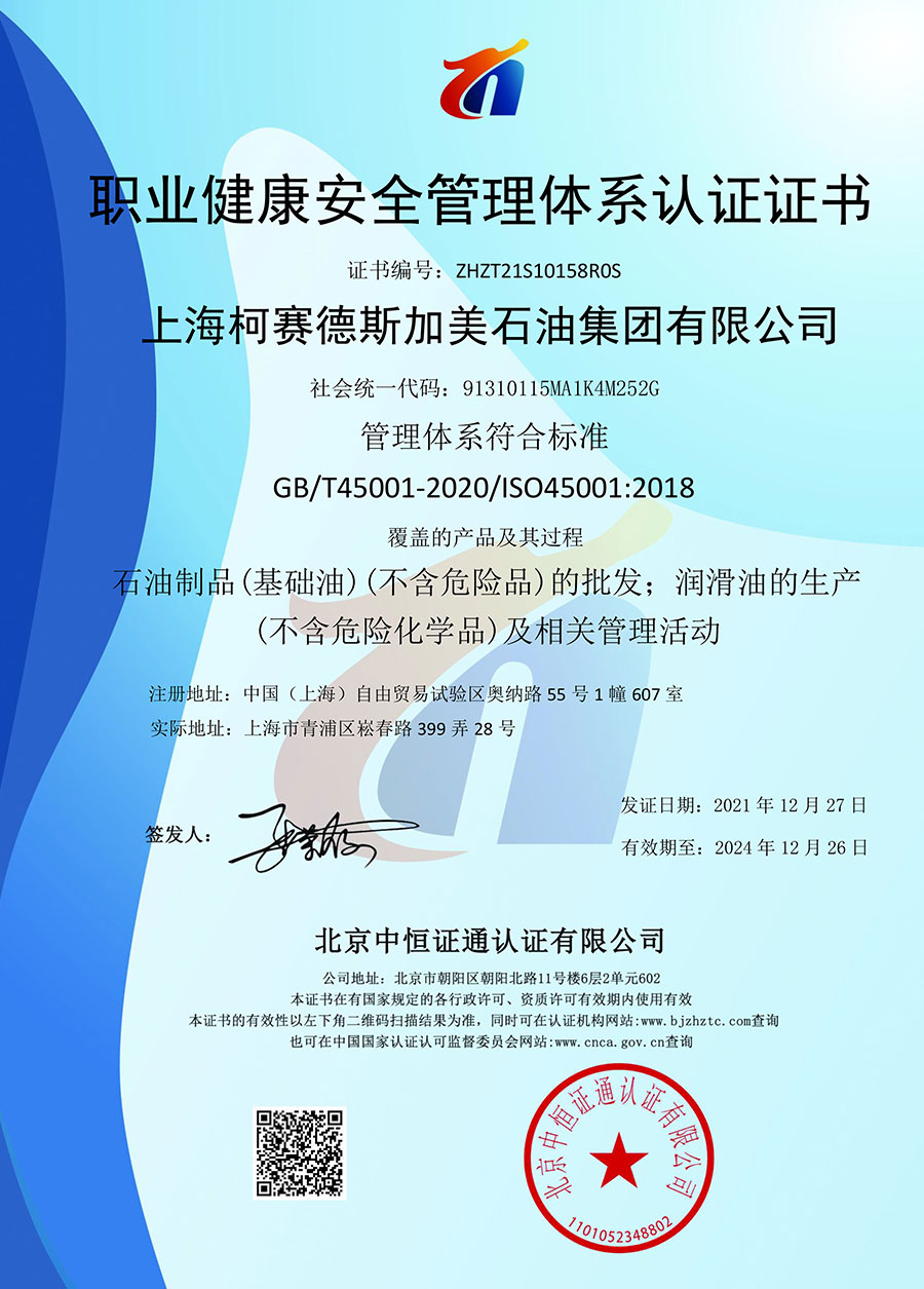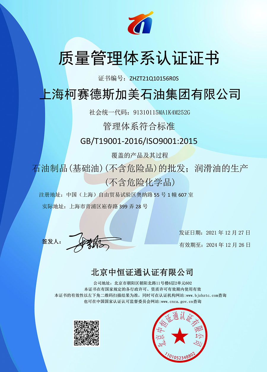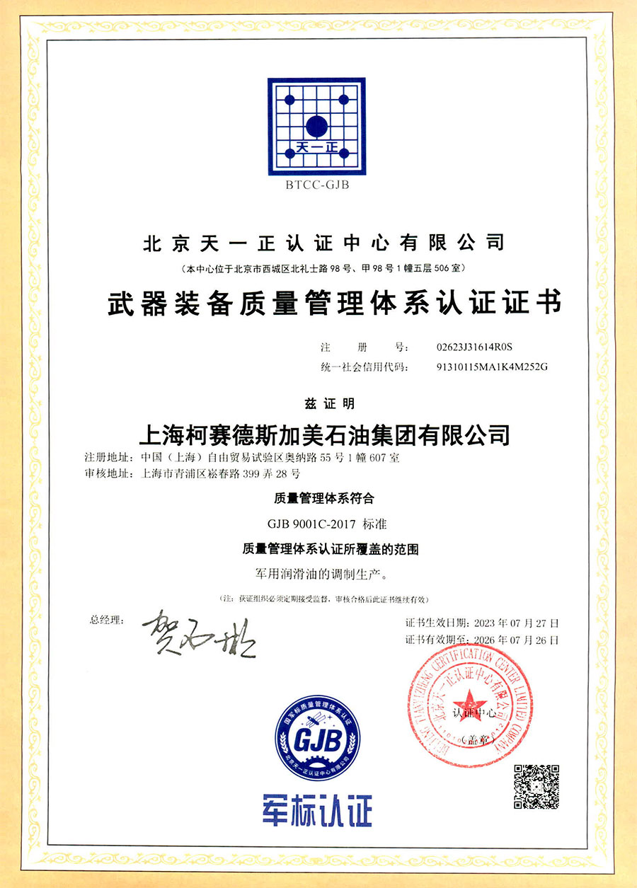 柯賽德斯集團(tuán)公司統(tǒng)一遵循嚴(yán)格的質(zhì)量保證體系,先后通過了武器裝備質(zhì)量管理體系認(rèn)證GJB9001C-2017、ISO/TS16949、IS09001質(zhì)量體系認(rèn)證、1S014001環(huán)境體系認(rèn)證及ISO45001:2018職業(yè)健康安全管理體系認(rèn)證。隨著業(yè)務(wù)領(lǐng)域的不斷擴(kuò)展,目前柯賽德斯集團(tuán)公司先后與多家世界能源、化工方面的巨頭建立了產(chǎn)品服務(wù)、供應(yīng)保障、技術(shù)合作、技術(shù)特別支持單位等方面的戰(zhàn)略合作關(guān)系。今天,柯賽德斯集團(tuán)公司旗下管理著三大潤滑油品牌,實(shí)現(xiàn)了經(jīng)營上的多元化戰(zhàn)略格局。