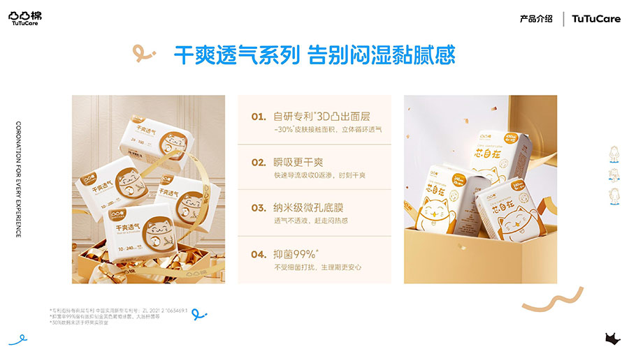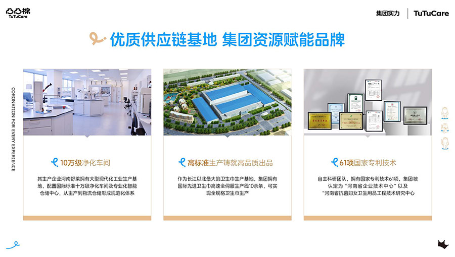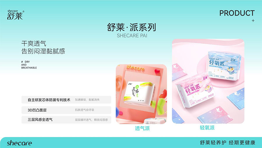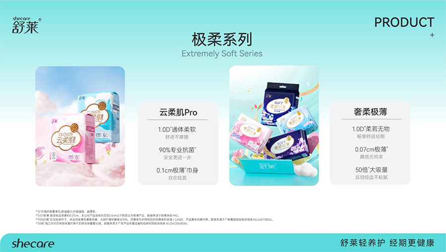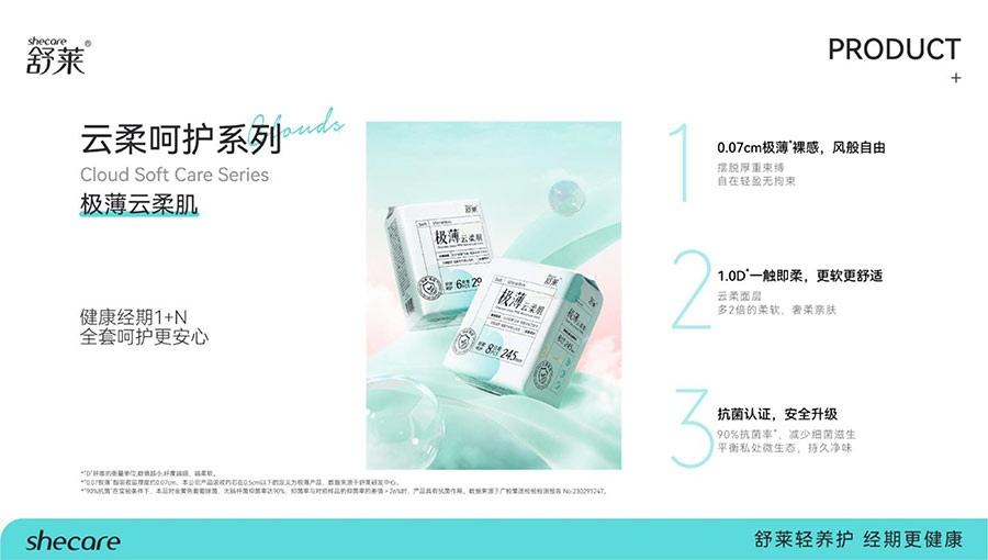 河南舒萊衛(wèi)生用品有限公司旗下?lián)碛惺嫒R、凸凸棉、純也、優(yōu)月季等品牌,產(chǎn)品涵蓋衛(wèi)生巾、安睡褲、護(hù)理液等品類。其中,舒萊品牌:S.H.E.CARE經(jīng)期健康管理體系,從科學(xué)、健康、舒適三大維度全方位呵護(hù)女性經(jīng)期健康。舒萊“輕養(yǎng)護(hù)”以漢方調(diào)養(yǎng)為根基,以科學(xué)抑護(hù)為本色,全方位調(diào)節(jié)女性經(jīng)期健康指數(shù),輕松實(shí)現(xiàn)經(jīng)期護(hù)理;凸凸棉品牌:獨(dú)創(chuàng)A.C.E.CARE品質(zhì)管理體系,以Air Tech干爽透氣、Comfort Tech舒適體感、Ecology Tech安全衛(wèi)生為核心,打造更懂女性的護(hù)理體驗。