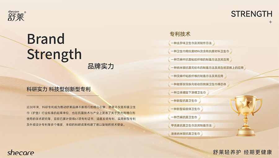 舒萊作為抑菌衛(wèi)生巾行業(yè)標(biāo)準(zhǔn)起草單位,目前累計擁有61項國家專利(含發(fā)明專利、實(shí)用新型及外觀專利),也在抗菌技術(shù)與產(chǎn)業(yè)上發(fā)表了關(guān)于熒光劑增白劑使用的學(xué)術(shù)研究等,構(gòu)建了難以復(fù)制的技術(shù)壁壘。