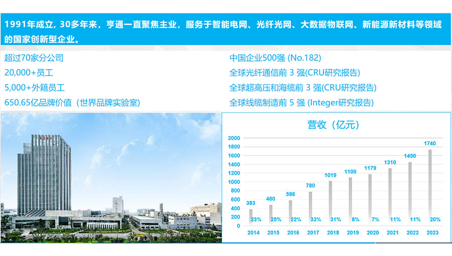 江蘇亨通電力電纜有限公司是亨通集團(tuán)旗下的一家國家級重點(diǎn)高新技術(shù)企業(yè),注冊商標(biāo)“亨通光電”,注冊資金185168萬元,成立于1995年,目前員工總數(shù)為一千余人??梢匝邪l(fā)制造220kV及以下交聯(lián)電力電纜、防火電纜、光纖復(fù)合電纜、光伏電纜、鋁合金電纜、電氣裝備電纜、控制電纜、低壓電線等產(chǎn)品,可滿足電力、通信、交通、冶金、石油石化、煤炭、船舶、軍工等不同行業(yè)、地區(qū)和國家客戶的差異化需求。