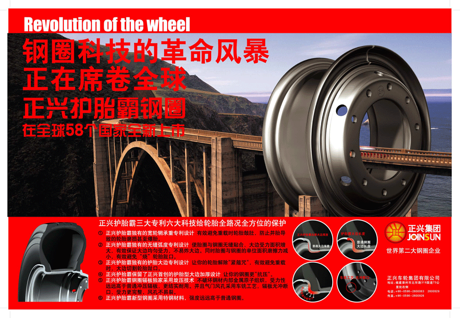正興集團在福建漳州(總部)、遼寧本溪、四川成都、河北廊坊、安徽合肥等地建有5家專業(yè)從事車輪制造的生產基地,產品以鋼制車輪為主,兼顧車橋、汽車螺栓等其它汽車零部件,市場營銷網絡覆蓋全國各省、市、自治區(qū),擁有銷售網點4000余個,并遠銷韓國、日本、印度、美國、歐洲、非洲、中美洲等70多個國家和地區(qū),為國內外100多家大、中型汽車廠配套。