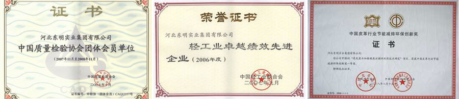 河北東明實(shí)業(yè)集團(tuán)有限公司創(chuàng)建于1996年,集團(tuán)下屬河北東明皮革有限公司、河北東明制衣有限公司、河北東明牛皮制革有限公司、東明金興制衣有限公司、東明酒店、東明商廈、河北東明中硅科技有限公司、辛集市東明房地產(chǎn)開(kāi)發(fā)有限公司八個(gè)子公司。集團(tuán)是按高標(biāo)準(zhǔn)、高起點(diǎn)、嚴(yán)要求興建的辛集地方特色產(chǎn)業(yè),經(jīng)過(guò)幾年的不懈努力,已發(fā)展成擁有職工3000人,制革能力和產(chǎn)量在全國(guó)制革業(yè)中居前位,其中綿羊皮服裝革產(chǎn)銷量列第一位的中型民營(yíng)企業(yè)。獲得國(guó)家星火計(jì)劃獎(jiǎng)、國(guó)家農(nóng)副產(chǎn)品加工龍頭企業(yè)、國(guó)家優(yōu)秀鄉(xiāng)鎮(zhèn)企業(yè)、全國(guó)外商投資先進(jìn)企業(yè)、全國(guó)雙愛(ài)雙評(píng)先進(jìn)企業(yè);獲河北省著名商標(biāo)、河北省名牌、河北省質(zhì)量效益型先進(jìn)企業(yè)、河北省重合同守信用單位、河北省百?gòu)?qiáng)企業(yè)和石家莊市50強(qiáng)企業(yè)等80多個(gè)國(guó)家級(jí)獎(jiǎng)項(xiàng)和榮譽(yù)稱號(hào)。集團(tuán)在皮革行業(yè)樹(shù)立的良好聲譽(yù)使東明成為高品質(zhì)的代名詞,可信賴的經(jīng)營(yíng)作風(fēng)更獲得世界各地客戶贊賞!集團(tuán)近年來(lái)不斷加大技改投入,先后投入3個(gè)億人民幣進(jìn)行技術(shù)改造,投入2000萬(wàn)進(jìn)行環(huán)保污水處理,經(jīng)過(guò)不斷的創(chuàng)新改造,在環(huán)境保護(hù)和環(huán)境治理上取得了可喜成就。其中,無(wú)灰浸鞣、廢灰夜循環(huán)利用、廢鉻液循環(huán)利用工藝技術(shù),獲河北省科技廳科技成果獎(jiǎng),并在全國(guó)皮革行業(yè)推廣,取得豐厚的企業(yè)經(jīng)濟(jì)效益和社會(huì)效益。2009年獲全國(guó)輕工行業(yè)“節(jié)能減排環(huán)保創(chuàng)新獎(jiǎng)”。獲得全國(guó)“五一勞動(dòng)獎(jiǎng)狀”。河北東明實(shí)業(yè)集團(tuán)有限公司產(chǎn)品質(zhì)量獲得國(guó)家真皮生態(tài)皮革稱號(hào)、辛集市利稅大戶。近年來(lái)向社會(huì)捐資500萬(wàn)用于公益事業(yè)?,F(xiàn)在集團(tuán)勞動(dòng)關(guān)系和諧,曾被國(guó)家評(píng)為“雙評(píng)雙愛(ài)”先進(jìn)單位。多次被省評(píng)為“重合同守信用”企業(yè),客戶對(duì)產(chǎn)品質(zhì)量滿意率一直在99%以上,客戶對(duì)產(chǎn)品售后服務(wù)滿意度在99%以上。集團(tuán)成立以來(lái)致力于生產(chǎn)高質(zhì)量的產(chǎn)品,“以誠(chéng)信為根本,視質(zhì)量為生命”是東明人一貫遵循的準(zhǔn)則,也正是對(duì)這一目標(biāo)的不懈追求使公司不斷的發(fā)展壯大。集團(tuán)生產(chǎn)的綿羊服裝革,以其色澤均勻、手感柔軟著稱,不僅在國(guó)內(nèi)有很高的聲譽(yù),還贏得了國(guó)外許多廠家的青睞,已打入美國(guó)、加拿大、韓國(guó)、俄羅斯、香港等國(guó)外市場(chǎng)。