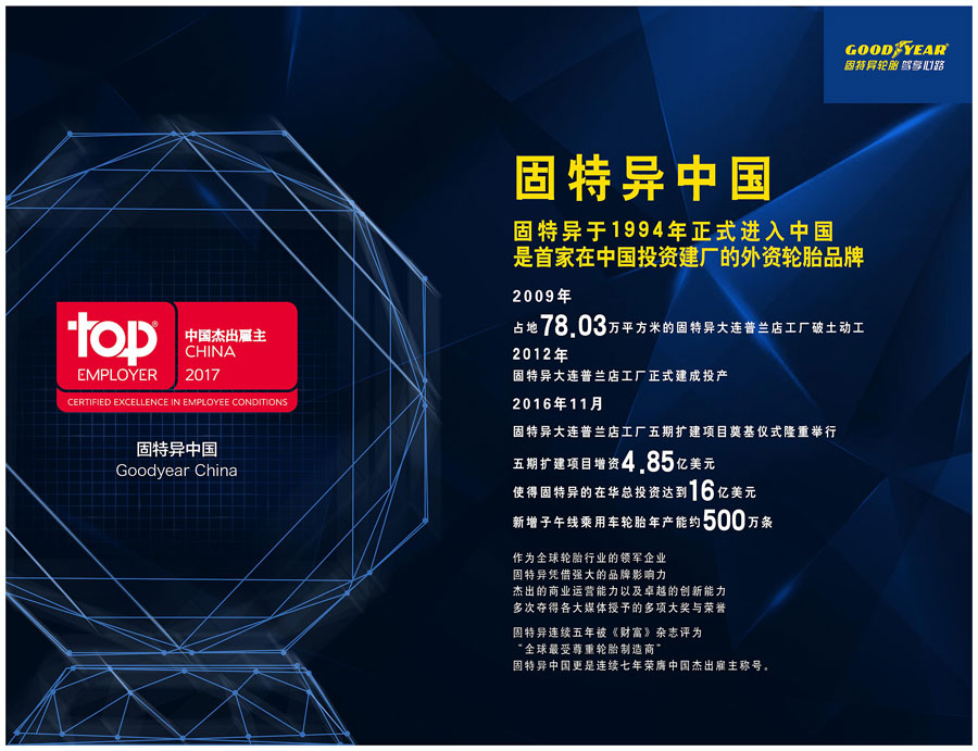 美國(guó)固特異輪胎于1994年9月率先進(jìn)入中國(guó)市場(chǎng),在大連創(chuàng)建了大連固特異輪胎有限公司,成為第一家來(lái)華投資建廠的西方輪胎企業(yè)。2008年11月,固特異大連通過(guò)股份收購(gòu)成為固特異的獨(dú)資公司。截至目前,固特異在中國(guó)已擁有2600多名員工。