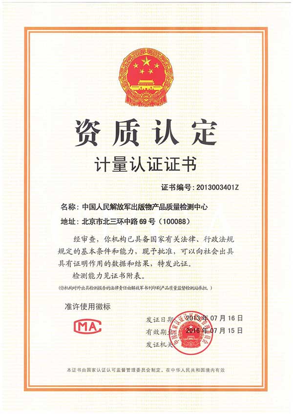 中國人民解放軍出版物產(chǎn)品質(zhì)量檢測中心(以下簡稱“檢測中心”)成立于2012年,2013年7月經(jīng)國家認(rèn)證認(rèn)可監(jiān)督委員會審核批準(zhǔn)授予中國計量認(rèn)證CMA認(rèn)可資質(zhì)。2014年9月通過國家認(rèn)證認(rèn)可監(jiān)督委員會計量認(rèn)證擴(kuò)項評審,批準(zhǔn)檢測能力三十余項。是全軍首家擁有國家級資質(zhì)的出版物產(chǎn)品質(zhì)量檢測鑒定機(jī)構(gòu),具有獨立為軍隊和社會提供公正、準(zhǔn)確的檢測數(shù)據(jù)及有法律效力的檢測報告的能力。