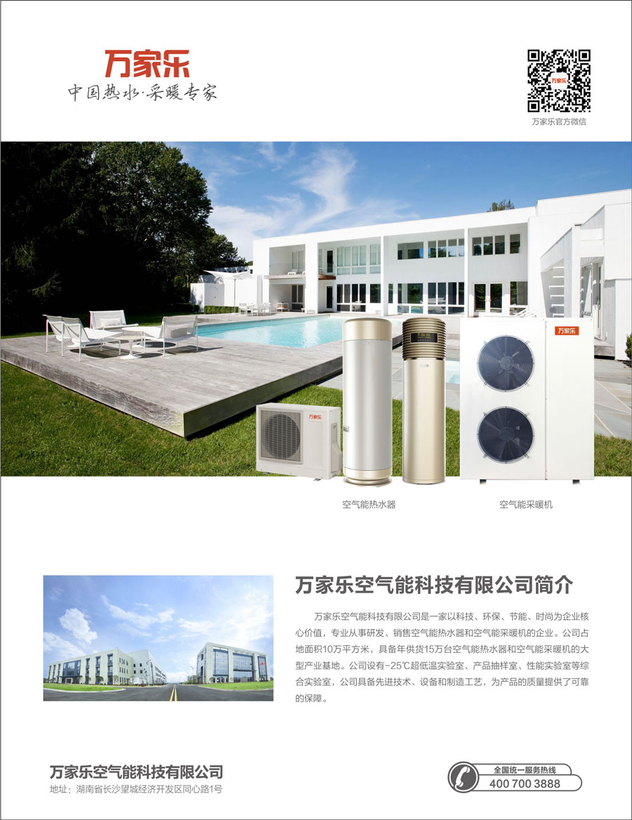 萬家樂空氣能科技有限公司是一家以科技、環(huán)保、節(jié)能、時尚為企業(yè)核心價值,專業(yè)從事研發(fā)、銷售空氣源熱泵采暖/熱水機(jī)的民族企業(yè)。公司占地面積10萬平方米,具備年供貨15萬臺空氣源熱泵采暖/熱水機(jī)及采暖末端設(shè)備的大型熱能產(chǎn)業(yè)基地。公司設(shè)有熱泵產(chǎn)品抽樣室、熱泵熱水機(jī)性能試驗室等綜合實驗室,引進(jìn)美國、日本等國的先進(jìn)技術(shù)、設(shè)備和制造工藝,為產(chǎn)品的質(zhì)量提供了可靠的保障。