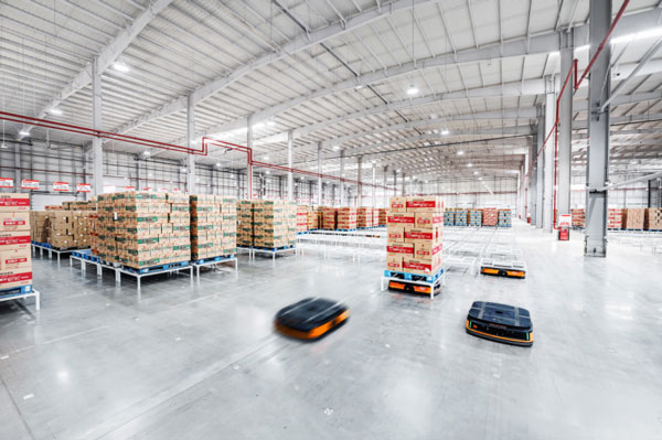 衛(wèi)龍倉庫內(nèi),智能AGV小車正在快速將產(chǎn)品搬運(yùn)到指定位置。