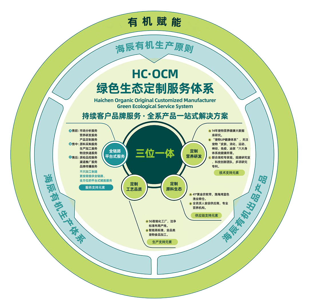 以品牌客戶的市場人群、寵物營養(yǎng)、產(chǎn)品功能三大需求為根本出發(fā)點,全力打造包含定制配方研發(fā)、定制生態(tài)原料、定制生產(chǎn)工藝、全鏈路平臺式服務(wù)四大方面在內(nèi)的海辰OCM綠色生態(tài)定制服務(wù)體系,致力于向品牌客戶提供值得信賴、更高品質(zhì)、強市場競爭力的品牌定制化產(chǎn)品開發(fā)與智造生產(chǎn)。