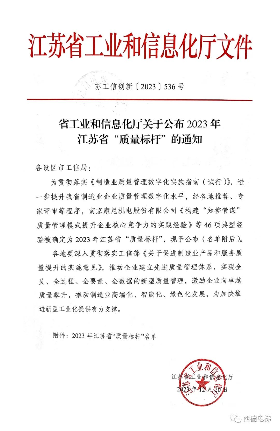 西德電梯獲評(píng)2023年江蘇省“質(zhì)量標(biāo)桿”企業(yè)