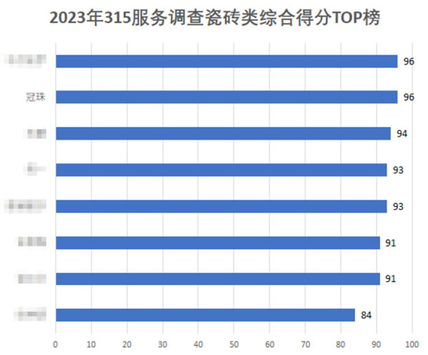 在2023年的315家居服務(wù)摸底中,共計(jì)調(diào)查了22家瓷磚品牌,綜合平均分達(dá)80.55分。其中,冠珠瓷磚以96分的成績高居第一位,再度蟬聯(lián)“年度家居行業(yè)服務(wù)榜樣”獎項(xiàng)。