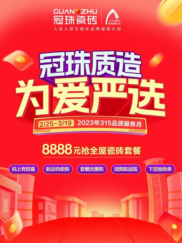 一直以來,冠珠始終堅(jiān)持“嚴(yán)”字當(dāng)頭,講中國故事,打造新國貨品牌形象。被認(rèn)可的背后是優(yōu)質(zhì)的服務(wù)與口碑的沉淀。3月9-15日,冠珠瓷磚315品質(zhì)服務(wù)月再出發(fā),為愛嚴(yán)選,為品質(zhì)發(fā)聲。用更好的產(chǎn)品、更好的服務(wù)、更好的體驗(yàn),筑就國人更美好的家。