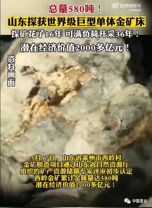 山東萊州市西嶺村金礦勘查項目通過省自然資源廳組織的儲量專家評審,初步認(rèn)定西嶺金礦新增金金屬量近200噸,累計金金屬量達(dá)580噸,潛在經(jīng)濟(jì)價值2000多億元,是迄今為止國內(nèi)發(fā)現(xiàn)的最大單體金礦床。