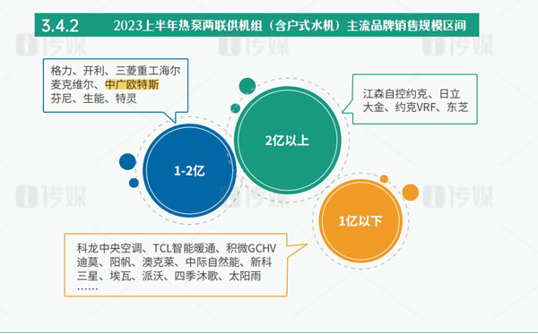 作為“熱泵行業(yè)領(lǐng)軍品牌”的中廣歐特斯,從2018年起逐步轉(zhuǎn)型向暖通與舒適家居領(lǐng)域滲透。經(jīng)過多年積累,中廣歐特斯在2023年上半年依然保持著逆勢(shì)而上的發(fā)展優(yōu)勢(shì),在主流品牌3億以下銷售規(guī)模中占據(jù)頭部位置。