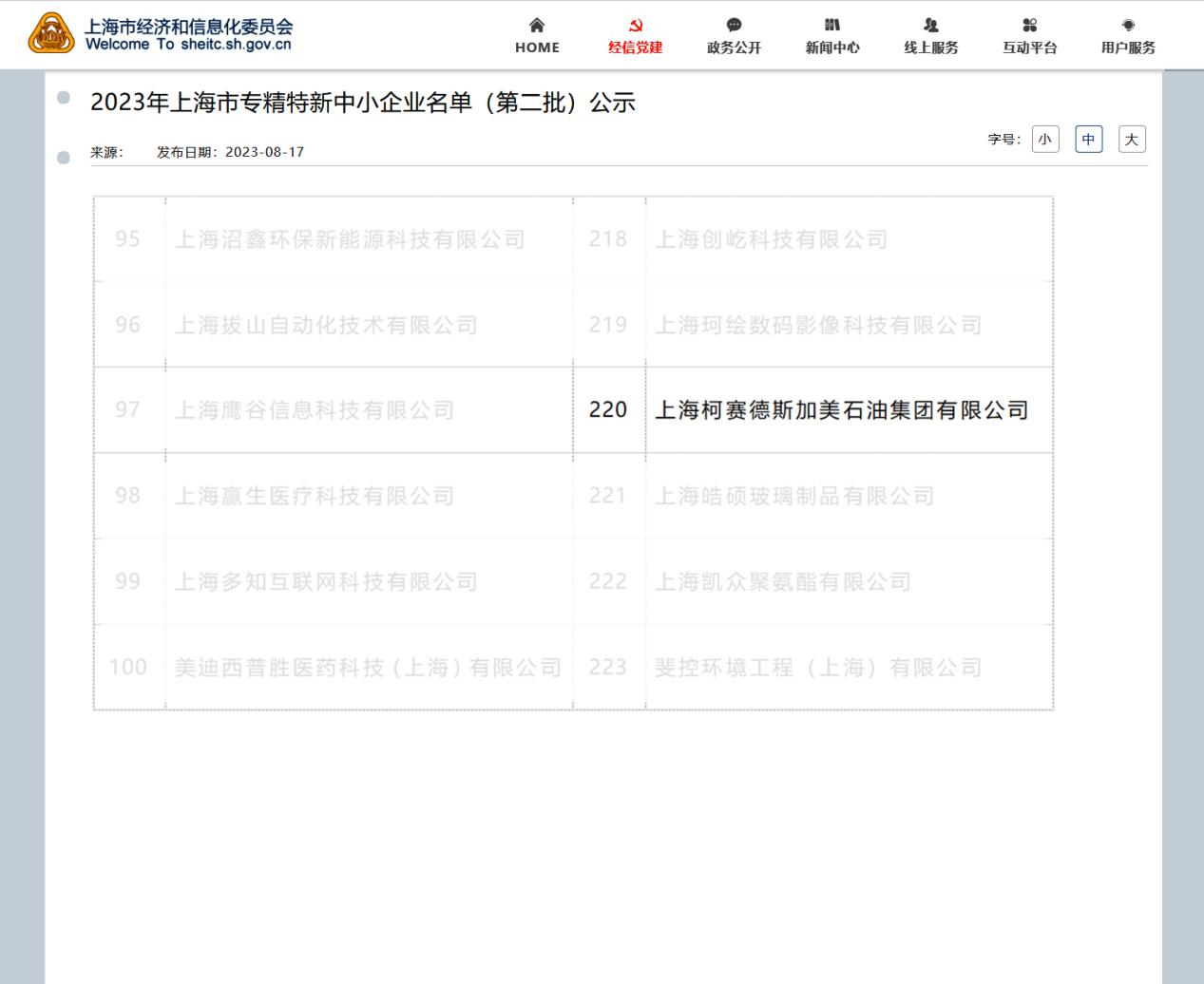 日前,從上海市經(jīng)濟(jì)和信息化委員官方網(wǎng)站發(fā)布的資訊顯示,2023年上海市專精特新中小企業(yè)名單(第二批)已經(jīng)公示,位于中國(上海)自貿(mào)區(qū)的上海柯賽德斯加美石油集團(tuán)有限公司進(jìn)入公示名單。