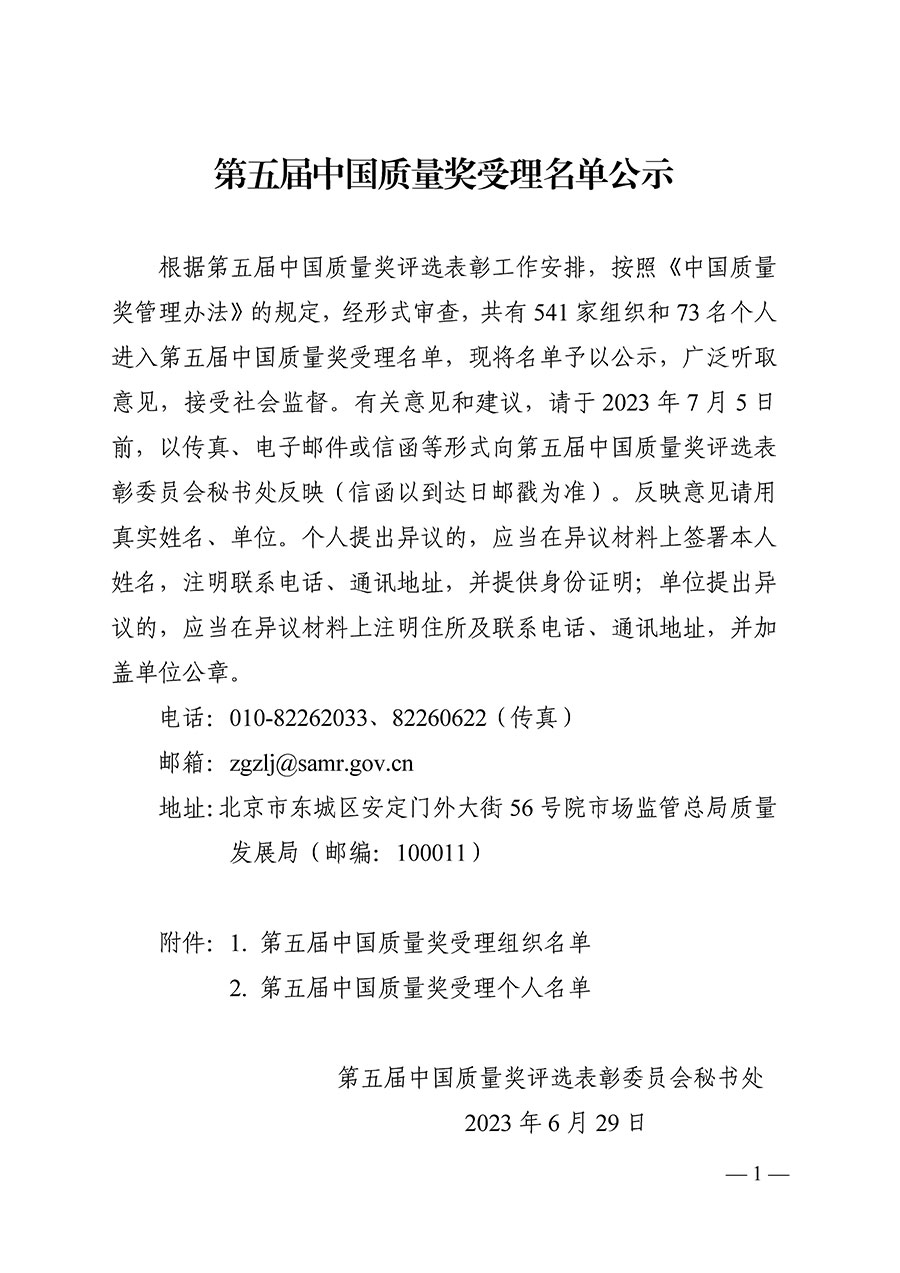 據(jù)悉,有關(guān)意見和建議可于 2023 年 7 月 5 日前,以傳真、電子郵件或信函等形式向第五屆中國質(zhì)量獎評選表彰委員會秘書處反映(信函以到達日郵戳為準(zhǔn))。反映意見應(yīng)當(dāng)用真實姓名、單位。個人提出異議的,應(yīng)當(dāng)在異議材料上簽署本人姓名,注明聯(lián)系電話、通訊地址,并提供身份證明;單位提出異 議的,應(yīng)當(dāng)在異議材料上注明住所及聯(lián)系電話、通訊地址,并加蓋單位公章。