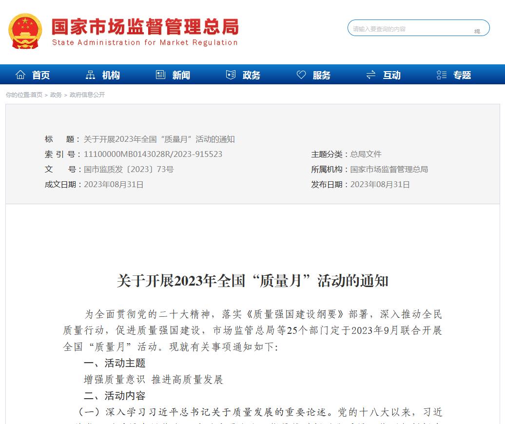 市場(chǎng)監(jiān)管總局等25個(gè)部門共同發(fā)布《關(guān)于開展2023年全國(guó)"質(zhì)量月"活動(dòng)的通知》發(fā)布