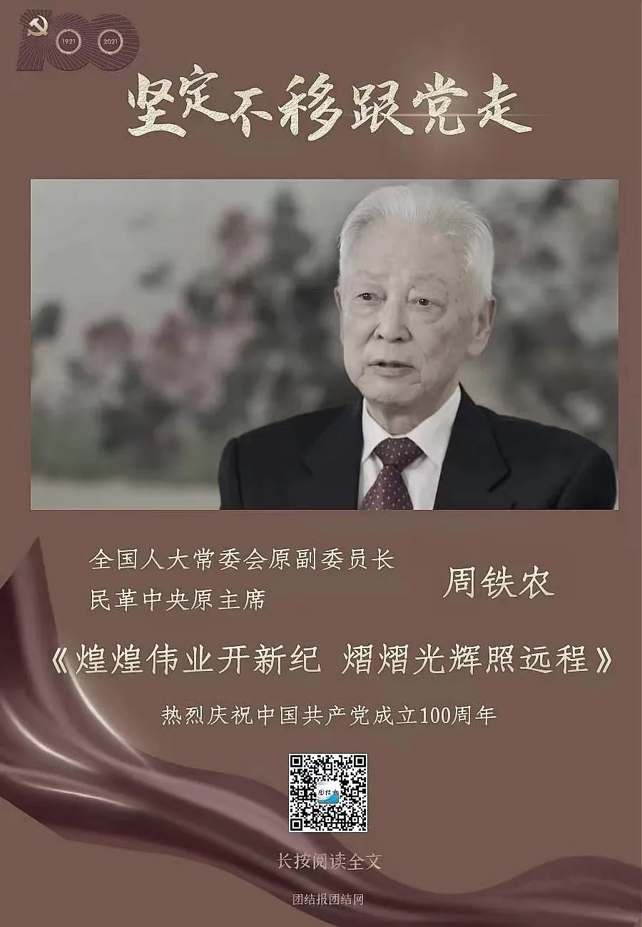 100年的理論和實踐證明,中國共產黨能帶領中國人民取得巨大成功絕非偶然,她的身上有著一系列的優(yōu)秀特質值得世人贊頌和學習。經過長期與中國共產黨合作共事,民主黨派領導人如何看待中國共產黨?對身邊的共產黨員又作何評價?在慶祝中國共產黨百年華誕之際,全國人大常委會原副委員長、民革中央原主席周鐵農接受了記者專訪。