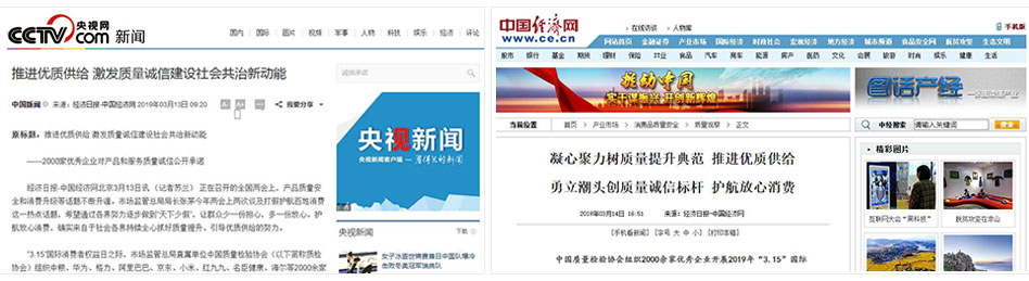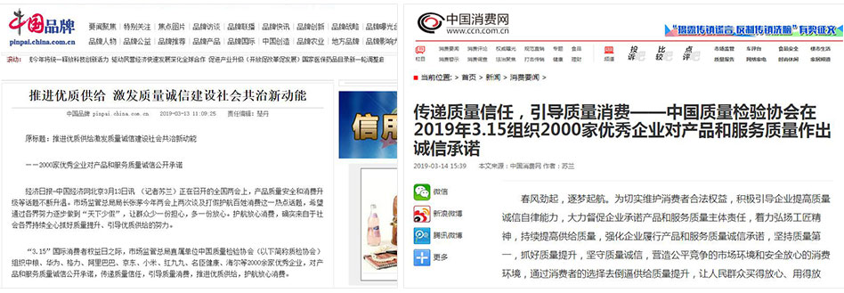 •中國消費(fèi)網(wǎng)《傳遞質(zhì)量信任,引導(dǎo)質(zhì)量消費(fèi)——中國質(zhì)量檢驗(yàn)協(xié)會(huì)在2019年3.15組織2000家優(yōu)秀企業(yè)對(duì)產(chǎn)品和服務(wù)質(zhì)量作出誠信承諾》