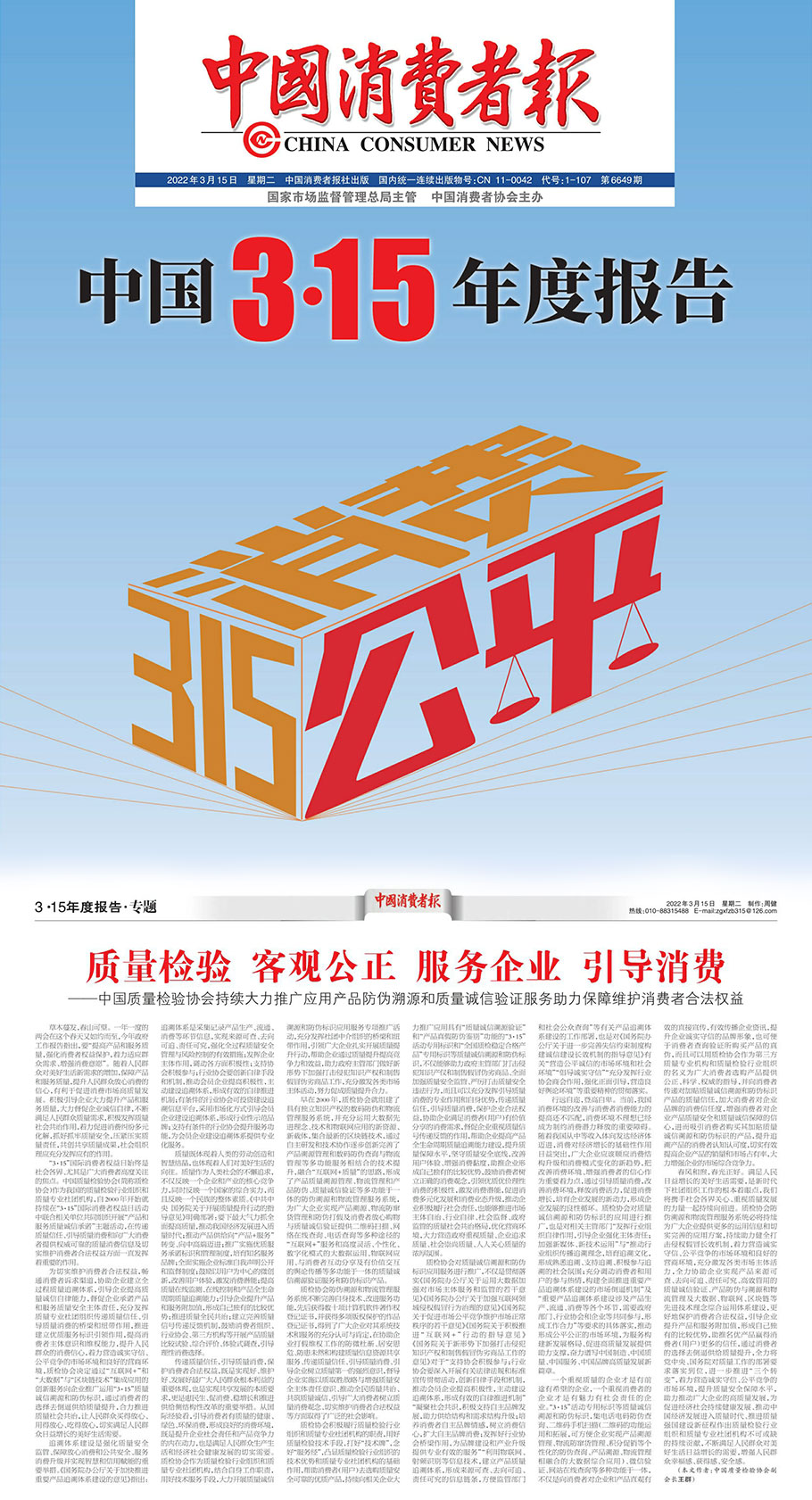 中國質(zhì)量報(3月15日刊第2版):推動質(zhì)量共治 優(yōu)化營商環(huán)境 共筑質(zhì)量誠信——中國質(zhì)量檢驗(yàn)協(xié)會攜手2000余家企業(yè)組織開展“3 ·15”產(chǎn)品和服務(wù)質(zhì)量誠信承諾主題活動