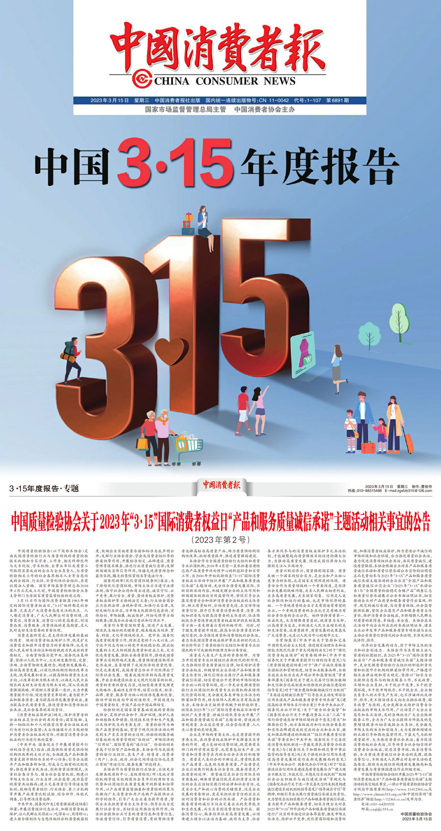中國消費(fèi)者報:中國質(zhì)量檢驗(yàn)協(xié)會關(guān)于2023年“3·15”國際消費(fèi)者權(quán)益日“產(chǎn)品和服務(wù)質(zhì)量誠信承諾”主題活動相關(guān)事宜的公告