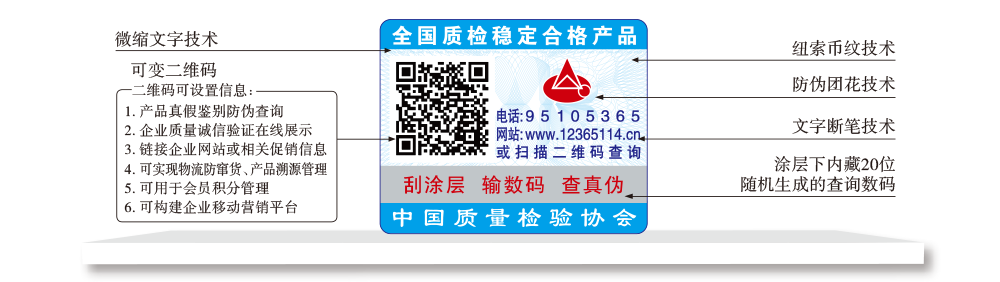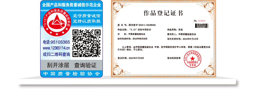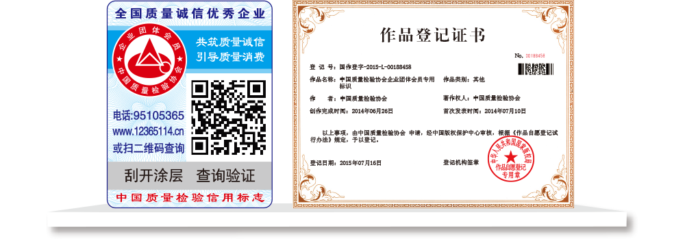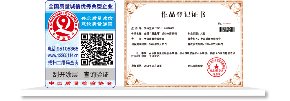 【“全國(guó)質(zhì)檢穩(wěn)定合格產(chǎn)品”專用標(biāo)識(shí)】具有專屬的知識(shí)產(chǎn)權(quán)(經(jīng)中國(guó)版權(quán)保護(hù)中心審核,國(guó)家版權(quán)局對(duì)“全國(guó)質(zhì)檢穩(wěn)定合格產(chǎn)品”專用標(biāo)識(shí)頒發(fā)了《作品登記證書》,登記號(hào):國(guó)作登字-2015-L-00188456),基本規(guī)格為5cm2,集電話電碼防偽查詢、二維碼在線掃描、微信驗(yàn)證等多種功能于一體,綜合運(yùn)用了紐索幣紋、微縮文字、熒光激發(fā)油墨等多種防偽技術(shù);專用標(biāo)識(shí)加貼在產(chǎn)品或包裝上,消費(fèi)者只需要用座機(jī)(手機(jī))電話撥打全國(guó)范圍內(nèi)都不需要加區(qū)號(hào)的特服號(hào)碼95105365或使用手機(jī)掃描二維碼或登陸網(wǎng)站(http://www.12365114.cn)就可直接查詢驗(yàn)證加貼專用標(biāo)識(shí)的產(chǎn)品為中國(guó)質(zhì)量檢驗(yàn)協(xié)會(huì)調(diào)查匯總證明的全國(guó)質(zhì)量檢驗(yàn)穩(wěn)定合格產(chǎn)品,助力企業(yè)通過“質(zhì)量檢驗(yàn)”的比較優(yōu)勢(shì)去贏得消費(fèi)者更多的信任,形成企業(yè)自己獨(dú)有的比較優(yōu)勢(shì)。