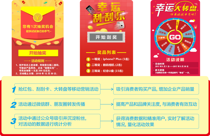 消費(fèi)者購(gòu)買企業(yè)的產(chǎn)品后,掃描標(biāo)識(shí)上的二維碼,參與企業(yè)設(shè)置的搶紅包、刮刮卡、大轉(zhuǎn)盤等營(yíng)銷互動(dòng)活動(dòng),中獎(jiǎng)后直接進(jìn)入微信公眾號(hào)領(lǐng)取,操作簡(jiǎn)單方便,在實(shí)現(xiàn)企業(yè)促進(jìn)產(chǎn)品銷售的同時(shí),還可增加企業(yè)微信公眾號(hào)的粉絲數(shù)量;同時(shí),充分利用移動(dòng)互聯(lián)網(wǎng)易于傳播的特性,實(shí)現(xiàn)企業(yè)品牌的廣泛傳播,采用多種移動(dòng)創(chuàng)新營(yíng)銷方式,結(jié)合數(shù)據(jù)統(tǒng)計(jì)分析,幫助企業(yè)實(shí)現(xiàn)精準(zhǔn)營(yíng)銷;另外,通過抽獎(jiǎng)、助力、積分兌換等主流營(yíng)銷活動(dòng),吸引、刺激消費(fèi)者持續(xù)消費(fèi)、分享傳播,進(jìn)而有效提高企業(yè)的產(chǎn)品銷量;還有,也可針對(duì)企業(yè)某一種產(chǎn)品進(jìn)行單獨(dú)促銷開展?fàn)I銷活動(dòng),消費(fèi)者掃描二維碼參與營(yíng)銷互動(dòng)活動(dòng),輕松實(shí)現(xiàn)促銷之目的,收集營(yíng)銷活動(dòng)數(shù)據(jù),借助大數(shù)據(jù)分析,分析消費(fèi)者的特征、分布、消費(fèi)習(xí)慣等信息,引導(dǎo)企業(yè)的市場(chǎng)營(yíng)銷戰(zhàn)略和銷售策略,使企業(yè)營(yíng)銷舉措更加精準(zhǔn)有效。