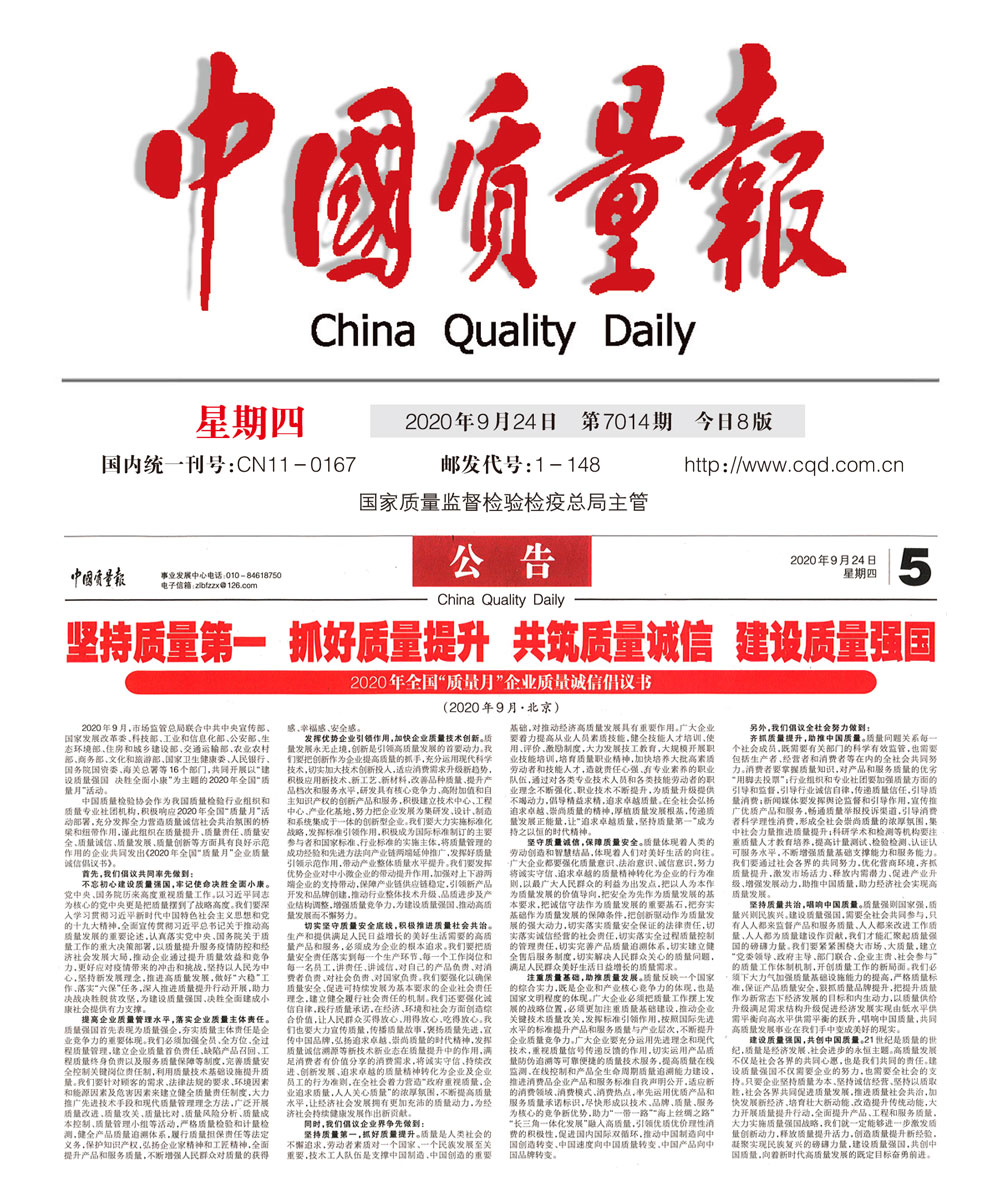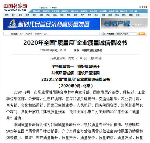 中國經(jīng)濟網(wǎng):堅持質(zhì)量第一 抓好質(zhì)量提升 共筑質(zhì)量誠信 建設(shè)質(zhì)量強國——2020年全國“質(zhì)量月”企業(yè)質(zhì)量誠信倡議書