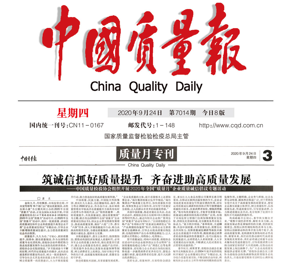中國質(zhì)量報:筑誠信抓好質(zhì)量提升 齊奮進(jìn)助高質(zhì)量發(fā)展——中國質(zhì)量檢驗協(xié)會組織開展2020年全國“質(zhì)量月”企業(yè)質(zhì)量誠信倡議專題活動