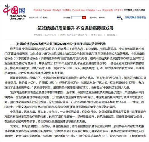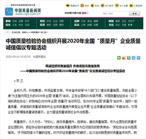 中國質(zhì)量新聞網(wǎng):筑誠信抓好質(zhì)量提升 齊奮進(jìn)助高質(zhì)量發(fā)展——中國質(zhì)量檢驗協(xié)會組織開展2020年全國“質(zhì)量月”企業(yè)質(zhì)量誠信倡議專題活動