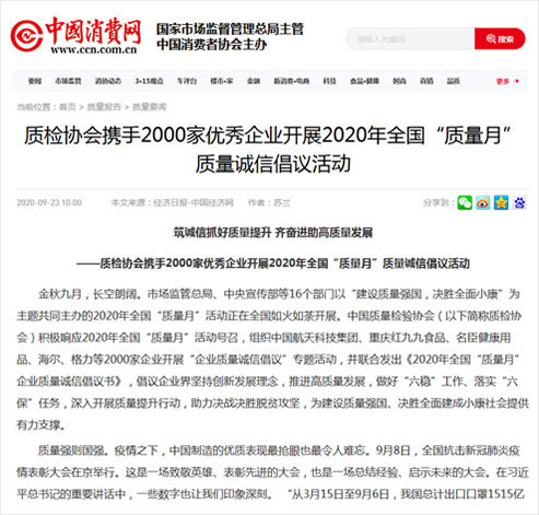 中國網(wǎng):筑誠信抓好質(zhì)量提升 齊奮進(jìn)助高質(zhì)量發(fā)展——質(zhì)檢協(xié)會攜手2000家優(yōu)秀企業(yè)開展2020年全國“質(zhì)量月”質(zhì)量誠信倡議活動