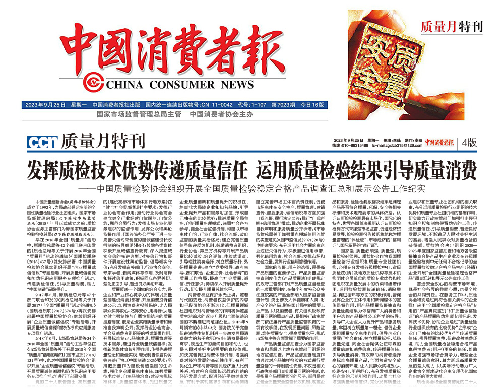 - 中國(guó)消費(fèi)者報(bào)——發(fā)揮質(zhì)檢技術(shù)優(yōu)勢(shì)傳遞質(zhì)量信任 運(yùn)用質(zhì)量檢驗(yàn)結(jié)果引導(dǎo)質(zhì)量消費(fèi)——中國(guó)質(zhì)量檢驗(yàn)協(xié)會(huì)組織開展全國(guó)質(zhì)量檢驗(yàn)穩(wěn)定合格產(chǎn)品調(diào)查匯總和展示公告工作紀(jì)實(shí)
