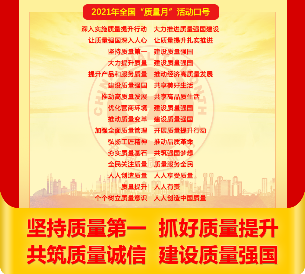 為深入貫徹習(xí)近平新時(shí)代中國特色社會(huì)主義思想,全面落實(shí)黨的十九大和十九屆二中、三中、四中、五中全會(huì)精神,立足新發(fā)展階段,貫徹新發(fā)展理念,構(gòu)建新發(fā)展格局,樹立質(zhì)量第一的強(qiáng)烈意識(shí),不斷提升質(zhì)量總體水平,大力推進(jìn)質(zhì)量強(qiáng)國建設(shè),市場(chǎng)監(jiān)管總局等20個(gè)部門定于2021年9月聯(lián)合開展以“深入實(shí)施質(zhì)量提升行動(dòng) 大力推進(jìn)質(zhì)量強(qiáng)國建設(shè)”為主題的2021年全國“質(zhì)量月”活動(dòng)。